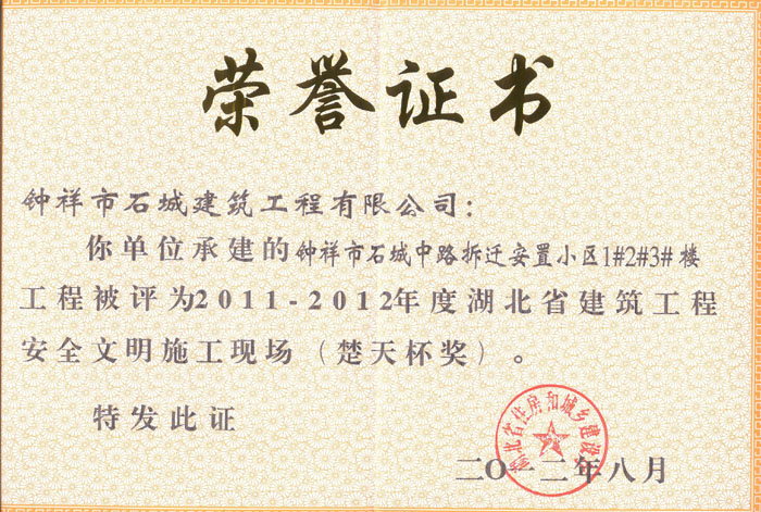 2012年8月被評(píng)為2011-2012年度湖北省建筑工程安全文明施工現(xiàn)場(chǎng)(楚天杯獎(jiǎng))