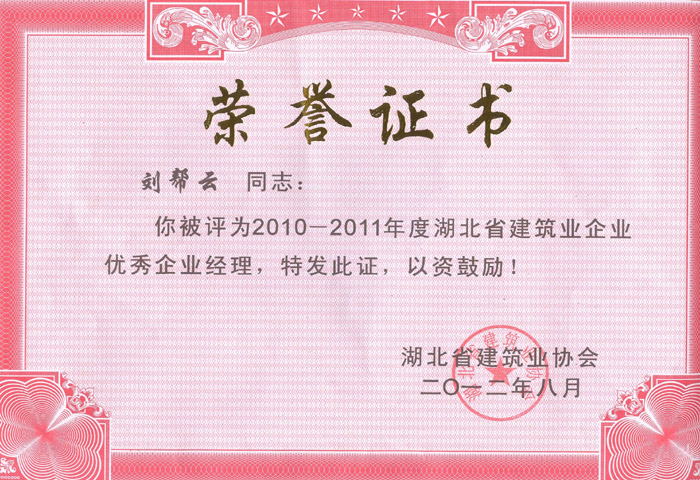 2012年8月劉幫云同志被評(píng)為2010-2011年度湖北省建筑企業(yè)郵箱企業(yè)經(jīng)理