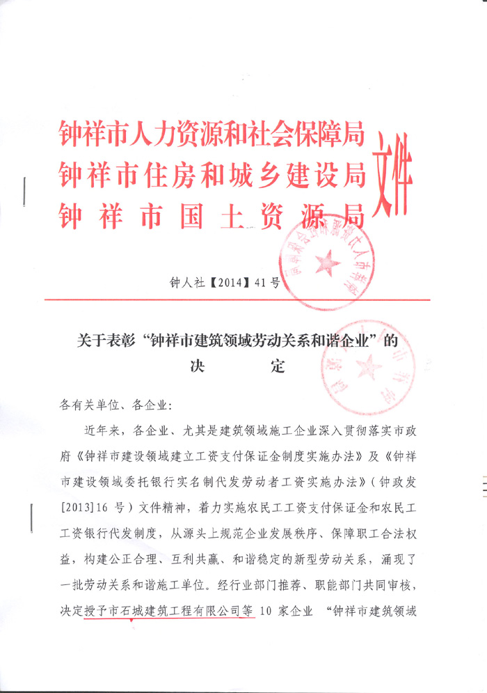 2014年4月榮獲“鐘祥市建筑領(lǐng)域勞動(dòng)關(guān)系和諧企業(yè)”稱號(hào)