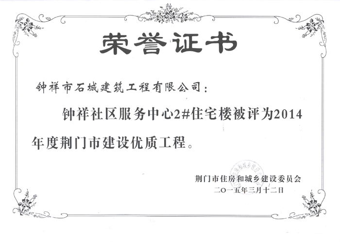 2015年3月12日被評(píng)為2014年度荊門市建設(shè)優(yōu)質(zhì)工程