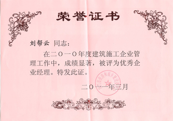2011年3月劉幫云同志被評為優(yōu)秀企業(yè)經(jīng)理