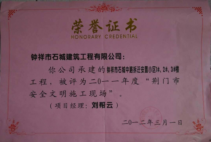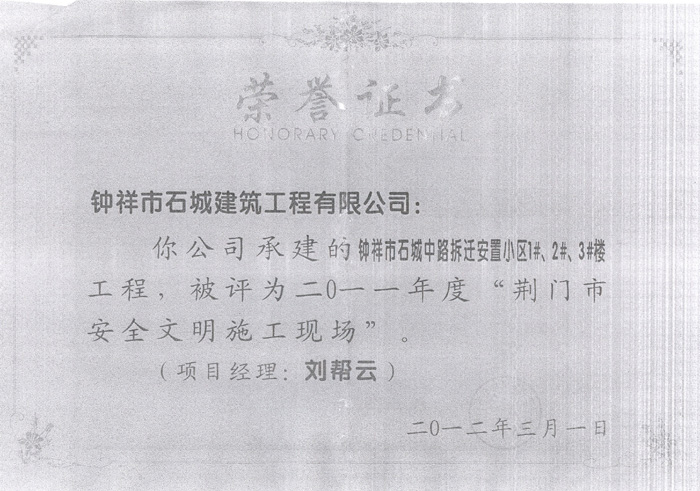 2012年3月被評為2011年度“荊門市安全文明施工現(xiàn)場”