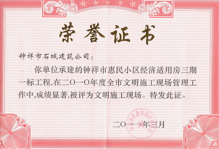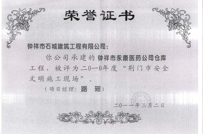 2011年3月被評為2010年度“荊門市安全文明施工現(xiàn)場”