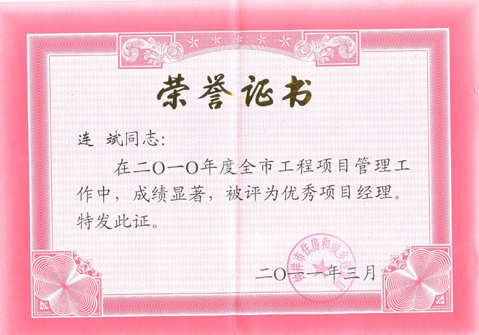 2011年3月連斌同志被評為優(yōu)秀項目經(jīng)理