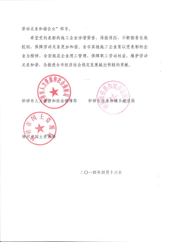 2014年4月榮獲“鐘祥市建筑領域勞動關系和諧企業(yè)”稱號